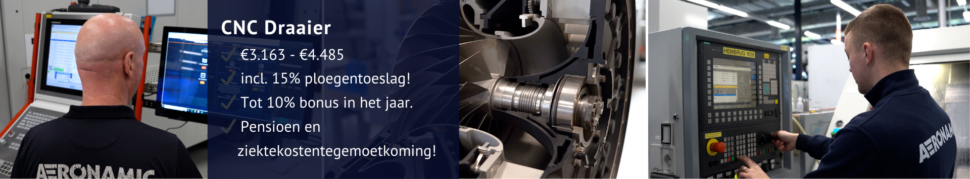 Je werkt in een modern en schoon machinepark met 18 CNC-machines. Je stelt voorgeprogrammeerde CAD/CAM-programma’s in met Fanuc of Siemens besturing, laadt tooling en stelt snijgereedschappen af. Vervolgens voer je de bewerkingen uit en controleer je je werk nauwkeurig met 3D-meetbanken van Zeiss en handmeetgereedschappen. Je wordt opgeleid om multi-inzetbaar te zijn op verschillende draaimachines.