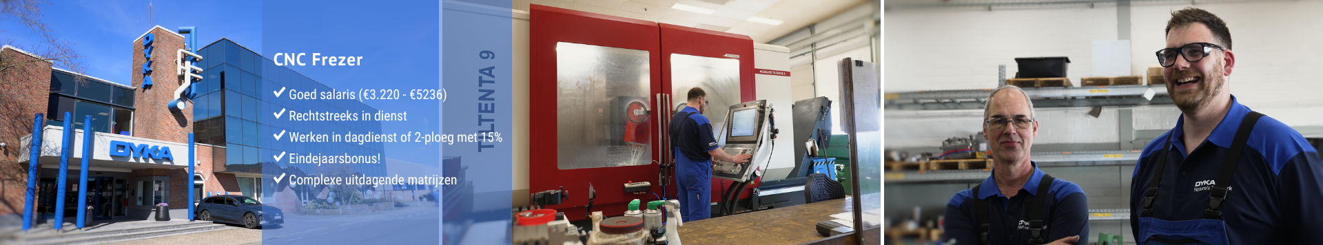 Binnen DYKA werken productie, technische dienst en gereedschapmakerij nauw samen. Dat zorgt voor korte lijnen en snel schakelen. De sfeer is rechttoe rechtaan: er wordt gewoon gewerkt, maar er is ook ruimte voor een grap en collega’s helpen elkaar als dat nodig is.